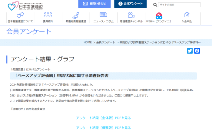 日本看護連盟「現場の声」活用促進委員会では、看護連盟会員が勤務する病院、訪問看護ステーションにおける「ベースアップ評価料」の申請状況を調査し、1314病院(回答率46.2%)および178訪問看護ステーション(回答率63.8%)から回答をいただきました。