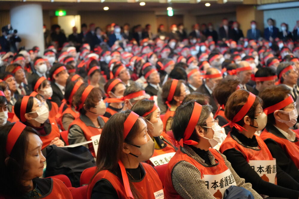 日本看護連盟からも、日本看護協会および一都二県(東京・千葉・神奈川)の看護連盟に呼びかけ、共に参集しました。会場には800名以上が詰めかけ、WEB視聴も1200回を超えるなど、改定率決定直前の最後の訴えにふさわしい、熱気に溢れた会となりました。